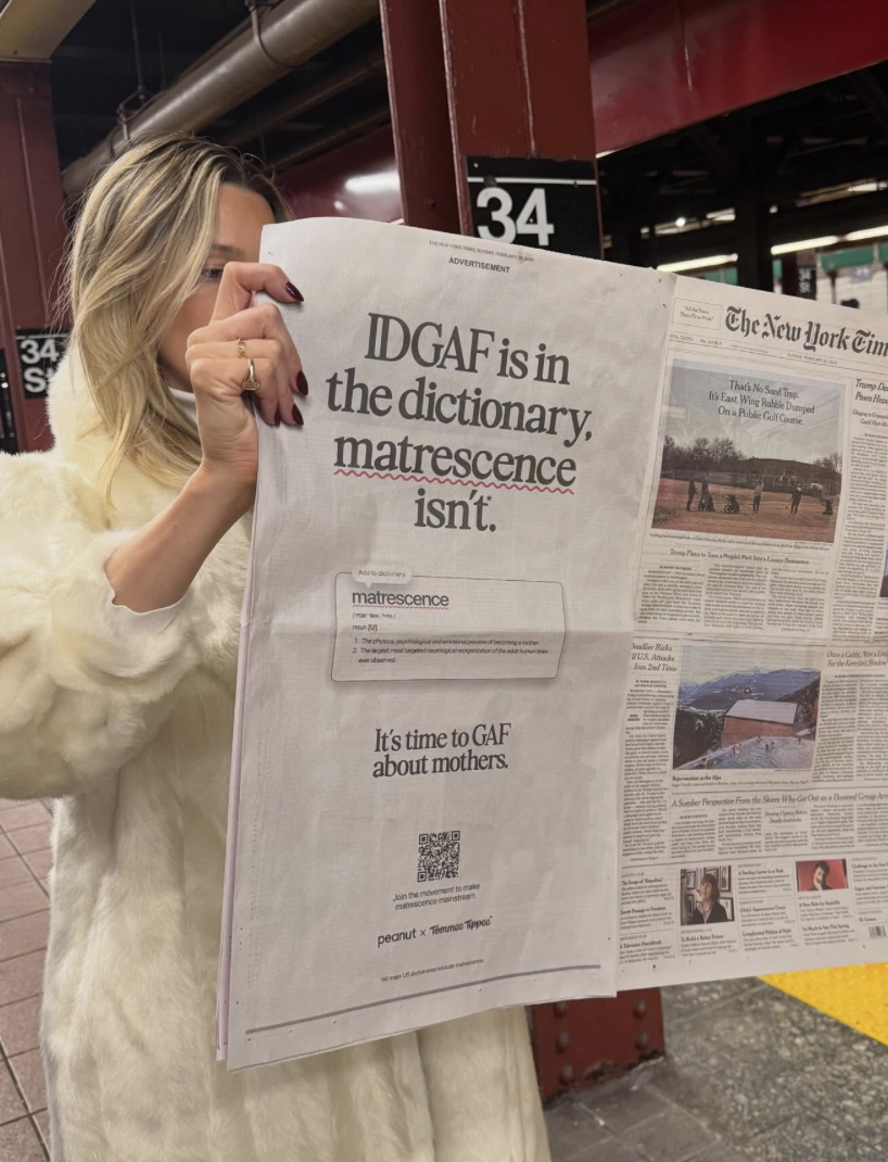 The Motherhood social app Peanut & the global children’s supplies company Tommee Tippee have teamed up to launch a campaign to #makematrescencemainstream. The adverts appeared all over the New York Times, in the UK projected onto the Baltic Centre for Contemporary Art and the Gateshead Millennium Bridge, the internet & social media. The world is starting to talk about Matrescence.